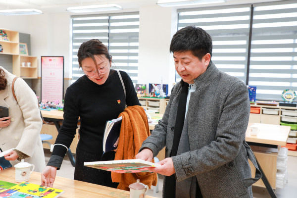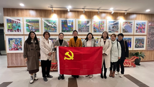 12月7日,经管系党总支副书记张媛带领系部文化创意与策划专任教师、旅游管理专任教师前往金山区科委命名的专家工作站“侯雨豪工作室”,学习调研了解非遗金山农民画艺术的特点、金山农民画衍生品的制作技法,并体验了AI技术下的文创品制作。