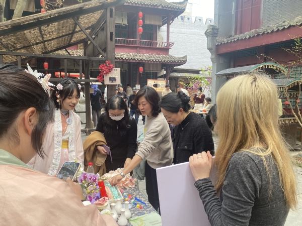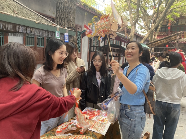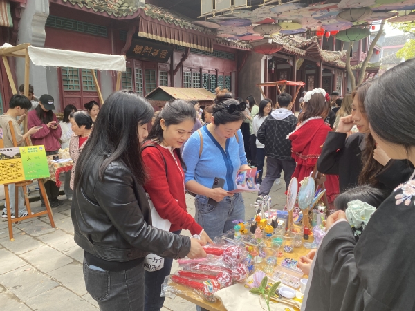 活动现场创意系师生为“百花节”增添了精彩的非遗和文创类项目。文创、旅管2个专业,文旅活动策划、文创产品设计、文案写作、新媒体营销实务等7门课程,8个班级270余位学生为叶榭村民呈现了一场优秀传统文化盛宴。葫芦、稻米文化、荷花漆扇、破晓龙狮等非遗把游客带入另一个非遗空间。投壶、蹴鞠、射箭、猜灯谜等传统游戏,吸引现场游客踊跃参与,人气爆棚。文创青年学生着古装铠甲组成禁军,维持秩序,展示表演并着古装接待摆摊展示文创小作品,同时为游客准备了古装体验、歌曲联动和文艺表演等节目。