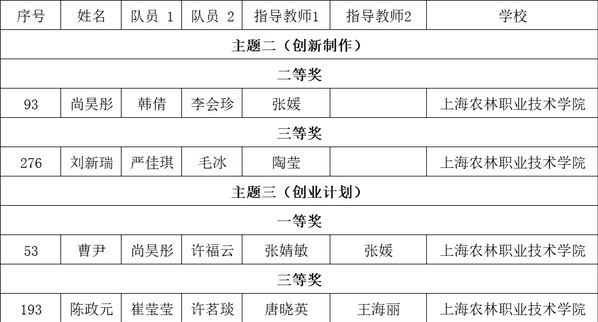 创意系共有4个作品入围总决赛:在主题二——创新制作组别中,尚昊彤、韩倩和李会珍获得二等奖,指导老师为张媛;刘新瑞、严佳琪和毛冰获得三等奖,指导老师为陶莹;在主题三——创业计划组别中,曹尹、尚昊彤和许福云获得一等奖,指导老师为张婧敏和张媛;陈政元、崔莹莹和许茗琰获得三等奖,指导老师为唐晓英和王海丽。此外,张媛老师和张婧敏老师荣获优秀指导老师称号。