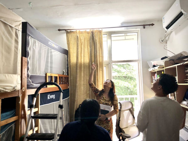 老师们带着沉甸甸的爱心物资,逐一走访了受灾学生的宿舍。老师们亲切地询问受灾学生的身体状况、家庭情况、墙体破损位置及修缮进度,了解目前面临的主要困难,学习生活的具体安排,鼓励他们保持乐观向上的心态,积极面对困难,学校永远是他们最坚强的后盾。