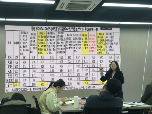 然后,王海丽反馈了近期学生期中教学质量问卷调查结果:本次问卷调查面向17个班级593位学生,涉及63门课程,收集2962份有效问卷,经过分析,本学期课程实训内容紧密结合行业实践,能有机融入相关行业发展新技术,学生对教师整体评分较高,平均分达到9分,但是在关注学生个性差异、帮助学生提高学习能力等方面还有待进一步提高。同时,对于学生座谈会上反映的实训活动开展、课堂纪律管理等问题逐一和老师们反馈交流,将教学诊断改进工作落到实处。