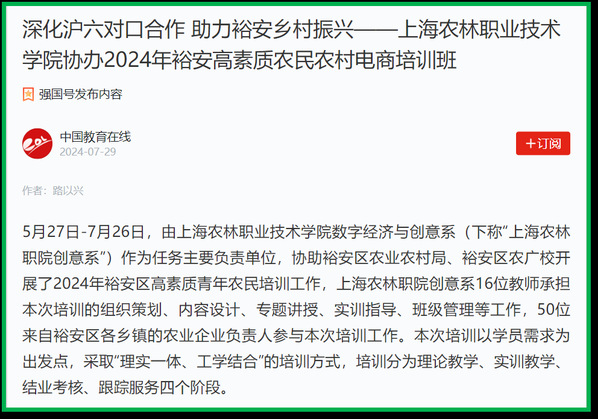近日,学院路以兴老师撰写的案例《响应沪六对口合作政策利用上海数字经济优势培育裕安新型职业农民》获上海市教育评估协会“第一届非学历教育优秀案例”一等奖,是高职院校中唯一入选“一等奖”的案例。本案例的获奖既是学院与裕安区对口合作的成果,又是学院扎实推进服务乡村振兴工作的见证。