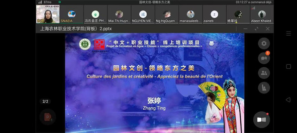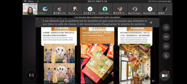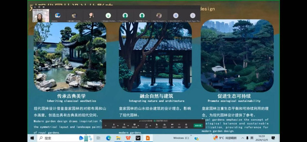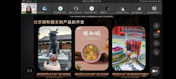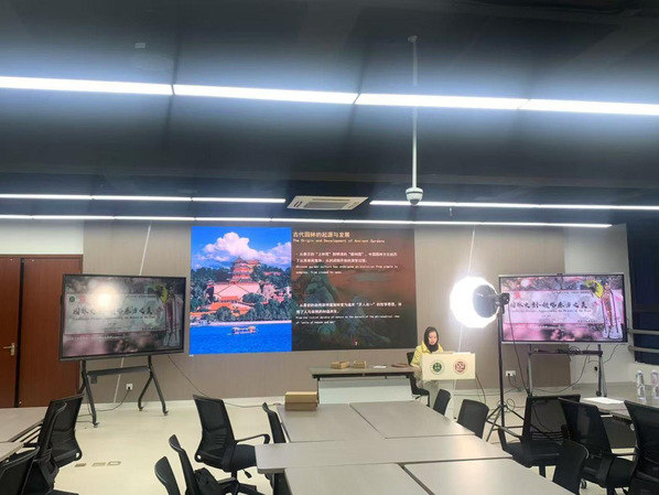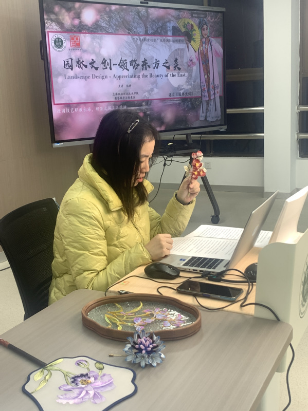 在《园林文创-领略东方之美》的课程中,张婷老师通过《中国园林文化浅谈》及《园林文创产品》的课程呈现了中国的传统文化、非遗技艺以及中国园林文创产业当前的发展情况等。以全新的视角阐述了中国园林文创的未来发展趋势,产品的未来市场及AIGC等科技手段的应用等。未来园林行业将融入数字文旅及数字文创,中国园林文创必将走向世界,进入快速发展的赛道。此外,张婷老师还介绍了中国的非遗苏绣作品、昆曲、京剧、绒花等传统文化,将风景园林创新中心的绒花作品、兰花珐琅作品及苏绣扇子进行了展示,将我校的学生成果有效的呈现给海外学生。