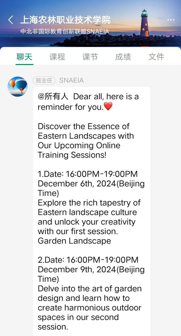 学院和系部高度重视本次培训课程,教师团队前期准备充分,课件制作精美,讲课内容丰富,受到北非学员和中北非国际教育联盟的一致好评,被评为“高质量,高美感”课程。本次培训是风景园林设计专业的首个职教出海项目,后期风景园林设计专业将继续发力,争取更多海外教育教学项目,尝试打造海外教学点,将中国造园技艺传播至世界各地。