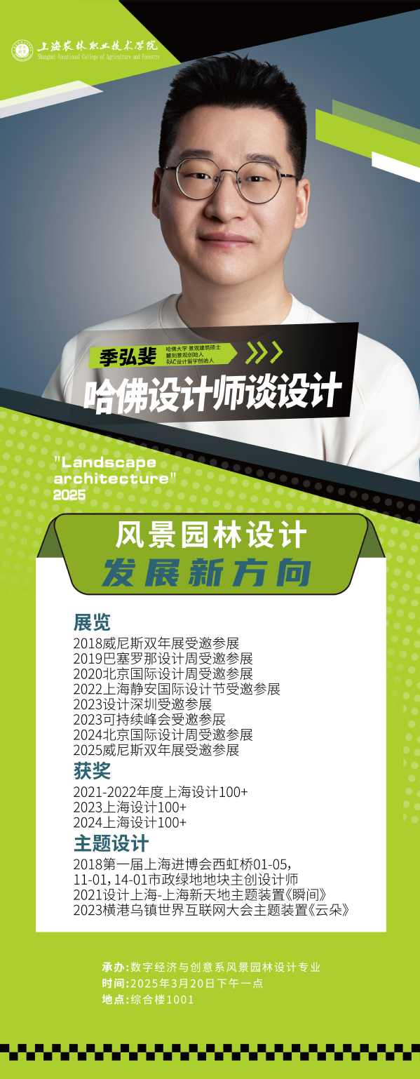 2025年3月20日,风景园林设计专业负责人张婷邀请了哈佛大学毕业的景观设计大咖季弘斐进行了“哈佛设计师谈设计”的专题教育讲座。季总是麓刻景观和RAC Studio创始人,哈佛大学MLA,师从全球顶尖风景园林大师玛莎•施瓦茨和国际景观生态学大师理查德•福曼等,曾经在荷兰景观设计公司B+B、AECOM等世界知名企业担任过资深设计师,主要项目经验有青岛红岛国家生态湿地公园,安康瀛湖富硒茶谷,郫县环城生态带,重庆迎龙湖国际湿地公园等。