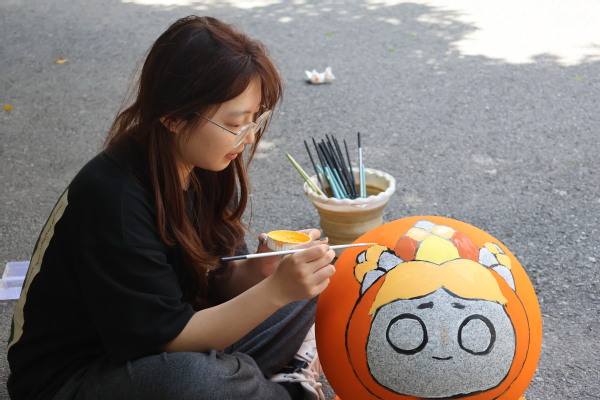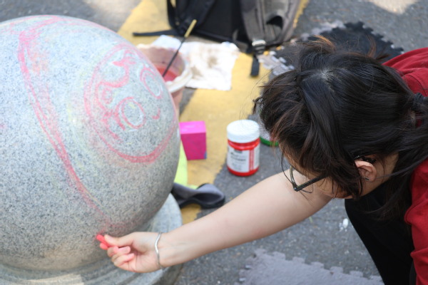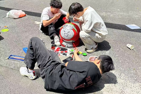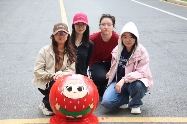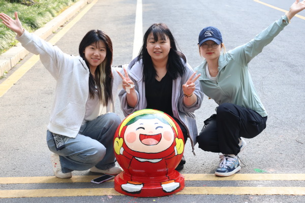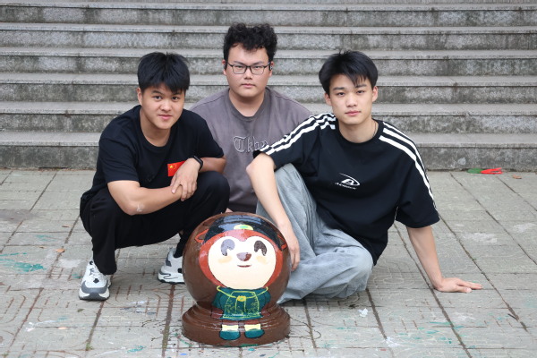 《构成设计》课程着重探究点、线、面、色彩等视觉元素的组合规律。经师生深入研讨,最终选定校园内闲置的10个石球作为实践载体,以校园为单位精心设计系列 IP 形象,并采用纯手绘方式呈现于立体石球之上。石球的圆弧曲面特性,为学生提供了极佳的空间构成意识和思维训练机会,而班级集体创作的过程,则有力凝聚了人心,汇聚了力量。