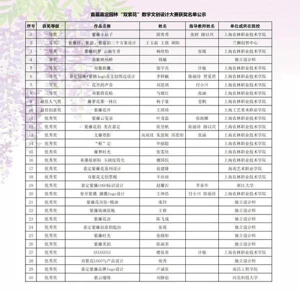 本次大赛共评选出一等奖1名、二等奖 2 名、三等奖 5 名,最佳人气奖1名,最佳创意奖1名,优秀奖20名。获奖作品在创意性、文化性和实用性等方面表现出色,充分展现了嘉定园林 “双紫花” 的特色和魅力。