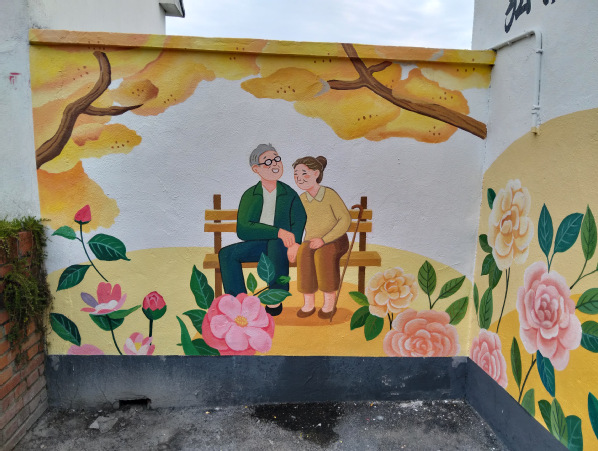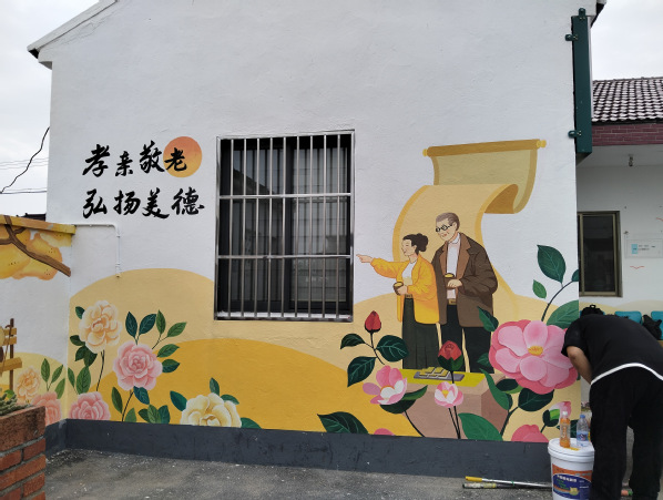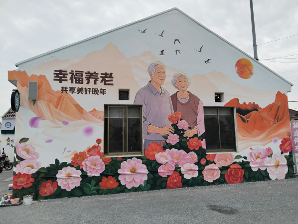 经过团队思考,2025王港村墙绘设计以“茶花映红韵,银龄绘新篇”为主题,深度融合王港村茶花、养老和红色文化三大特色,通过艺术创作展现村庄独特魅力。在整体构图上,将墙面划分为三大区域。顶部以盛放的茶花为基底,粉色花瓣舒展蔓延,花蕊点缀金色光芒,象征着王港村蓬勃的生命力。中部左侧展现红色文化,描绘飘扬的红旗;右侧呈现温馨的养老画面,老人手拿山茶花,展现和谐的养老氛围。主墙体用茶花、老人形象,寓意红色精神代代相传,滋养着村庄的美好生活。