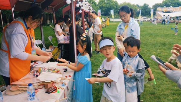 5月23日与5月31日,创意系师生分别开设非遗和国潮手作摊位。23日,合香珠制作区,师生指导市民游客用天然香料制作专属香氛信物;中药香囊与簪子非遗体验区,传统技艺展现新魅力,吸引不少人参与。31日,石膏娃娃彩绘区,大小朋友为胚体上色,童趣创意尽显;糖画、剪纸、漆扇非遗体验区,学生结合现代科技创作,让市民感受非遗精巧。