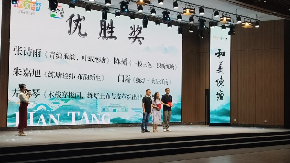 于10月1日在青浦Art-M阿特卖文化创意产业园举行的“‘非遗里的练塘’视频短片大赛颁奖礼”上,我院创意系党总支副书记张媛代表学院领取了该项大赛的“最佳组织奖”,创意系左宏琴老师的作品获得优胜奖。
