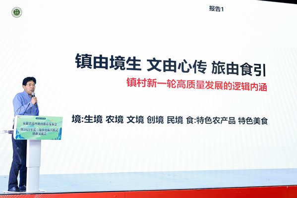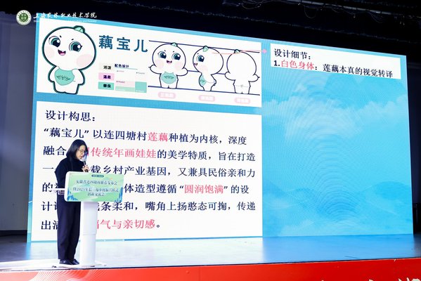 创意系主任路以兴在会上展示了服务六安的成果,通过连四塘村纪实短片呈现了专家教授和青年学子深入田间地头的景象,从“花香莲塘”规划、徽派庭院建设,到红色文化挖掘、农业品牌升级与数字化营销,通过“设计赋美、文化育美、品牌铸美、传播致美、经营创美”的五美服务体系,推动了连四塘村的美丽蜕变。创意系视觉传达设计专业负责人付小川汇报了对连四塘村的整个服务历程与发展理念,云间创意产业学院副院长贾爱君发布了融合当地特色的连四塘村IP形象,创意系教师党支部书记郁琦首发了《石婆店镇全域旅游地图》。六安市裕安区石婆店镇镇长张乐成在现场推介当地特色农副产品,大礼堂外侧同步开展了裕安特色农产品展示,促进了农产品的推广。