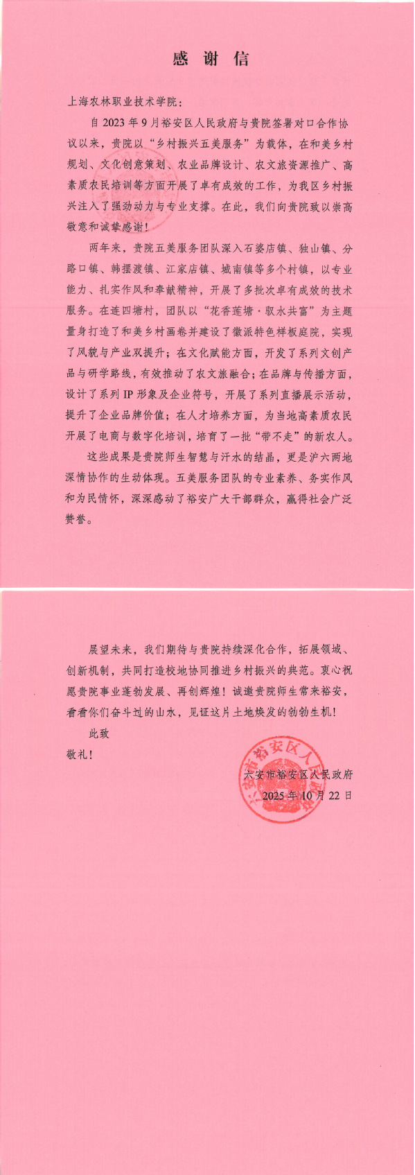 裕安区政府在信中特别指出:“五美服务团队的专业素养、务实作风和为民情怀,得到了裕安广大干部群众的认可,赢得社会广泛赞誉 。”信中还表达了对深化合作的期待,诚邀学院师生常赴裕安,共赏乡村振兴新图景。