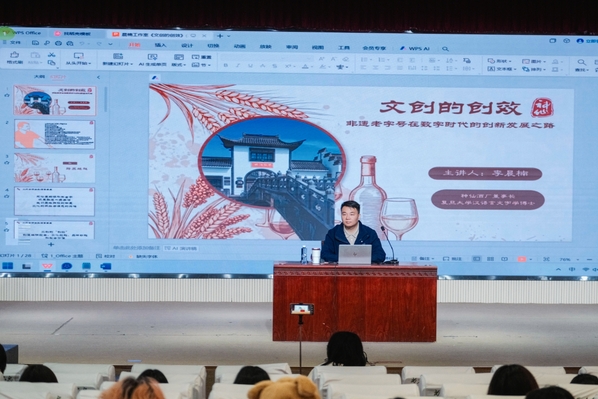 2025年10月29日14时40分,在学院205报告厅内,创意系邀请校外企业导师、神仙酒厂董事长、复旦大学汉语言文字学博士李晨楠做了一场《文创的创效——非遗老字号在数字时代的创新发展之路》的专题讲座,共150余名师生参与,创意系党总支副书记张媛主持。