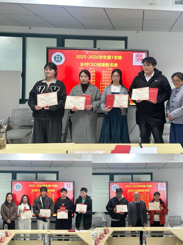在总结表彰环节,为王凯伦等多位学员颁发了优秀乡村主播、乡村服务成长之星等荣誉证书和奖品。上海福财园林艺术有限公司总经理刘仁环对CEO班学员在企业的表现进行了点评和总结,对于同学们在企业的表现给予了高度评价,对同学们的学习精神给予了表扬,希望同学们在下一学期能继续保持这份学习的热情和刻苦的干劲。松江区叶榭镇井凌桥村党委委员封佳慧表示乡村CEO班大学生的加入为井凌桥村的发展注入了鲜活的力量,井凌桥村也会继续高度支持乡村CEO班的工作,村委会也会继续做好协调,不断帮助同学们提高能力,并做好相关配套服务工作。松江区叶榭镇旅游公司负责人吴叶飞对乡村CEO班开办以来一学期工作及各位同学的表现给予了肯定,希望未来能有更多的机会让同学们承担叶榭镇的宣传和文旅工作,同时将协调叶榭镇的各方企业力量,为同学们未来的就业工作做好服务。