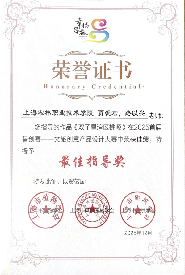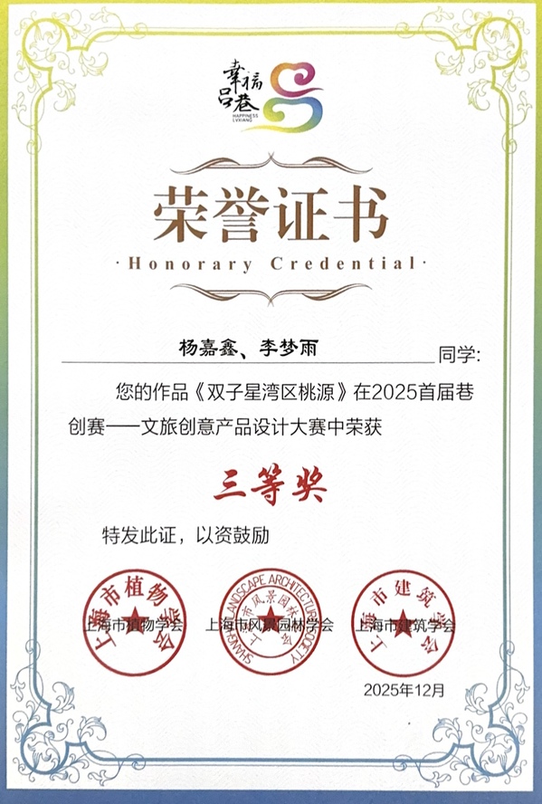 近日,2025首届“巷创赛”颁奖仪式在上海市金山区吕巷镇圆满落幕。创意系视觉传达设计专业学生杨嘉鑫、李梦雨在专业教师精准指导下,依托扎根乡土的创意设计作品,在文旅创意产品设计赛道中脱颖而出,成功斩获三等奖;宋子昕、祝心怡、李梓毓分别获得优秀特色奖和成长荣誉奖。此次获奖不仅展现了视觉传达专业学生扎实的专业功底,也充分体现了专业“以赛促教、以赛促学”育人模式的显著成效,彰显出青年设计力量服务乡村振兴的使命担当。