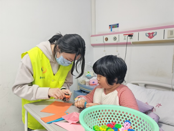 我系“医路童行”志愿服务团队坚持每周四下午走进医院儿童病房,以“游戏陪伴”为核心,通过搭积木、读绘本、手工制作、趣味互动等方式,为住院患儿送去温暖与欢笑,有效缓解病痛与焦虑,守护童真、助力康复。志愿者用耐心与爱心践行志愿精神,展现青年学子热心公益、乐于奉献的责任担当。
